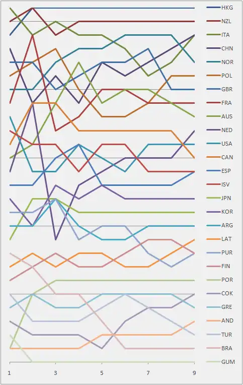 Graph showing the daily standings in the Mistral One Design Woman's during the 1996 Summer Olympics