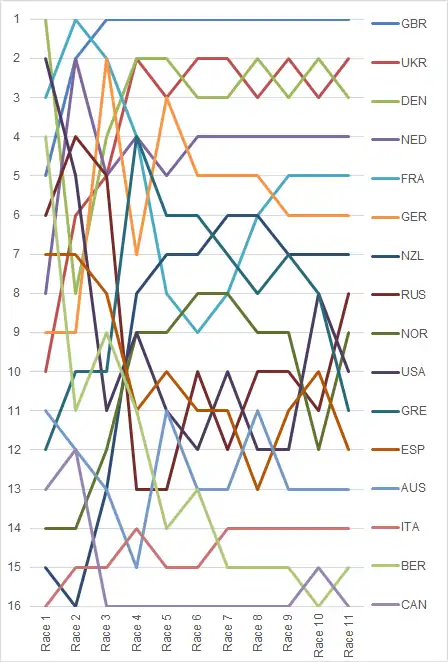 Graph showing the daily standings in the Yngling at the 2004 Summer Olympics