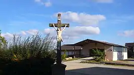The old village consists of three parallel streets cut by side streets and alleys between half-timbered houses, forming a compact oblong area still contained within a wall. The village centre contains the church, town hall and a 19th-century school building.