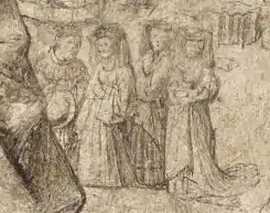 Three women behind and to Barbara's left are seen visiting the construction, each wearing similar houppelandes. The woman in the center raises her skirt to show her kirtle. They are each wearing headdress, probably burlets with ruffled golets draped from the head.[7]