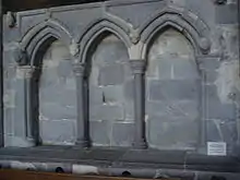 Rhigyfarch counted Glastonbury Abbey among the churches David founded.[9] Around forty years later William of Malmesbury, believing the Abbey older, said that David visited Glastonbury only to rededicate the Abbey and to donate a travelling altar including a great sapphire. He had had a vision of Jesus who said that "the church had been dedicated long ago by Himself in honour of His Mother, and it was not seemly that it should be re-dedicated by human hands". So David instead commissioned an extension to be built to the abbey, east of the Old Church. (The dimensions of this extension given by William were verified archaeologically in 1921.) One manuscript indicates that a sapphire altar was among the items Henry VIII of England confiscated from the abbey during the Dissolution of the Monasteries a thousand years later.