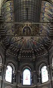 Burges designed the majority of the interior, including the mosaic pavement, the altar, the pulpit and bishop's throne.[47][48] The narrow and unusually high marble nave, from red and puce stone, is supported by large columns supporting the central tower and spire. The exterior gives the impression of a large structure, which is at odds with the reduced size of the interior, where the choir, sanctuary and ambulatory take up almost half of the floor-space.[49] The interior is filled with colour, most especially from the stained glass windows. This aspect of the interior is in marked contrast to the uniform and austere grey of the exterior.[49]