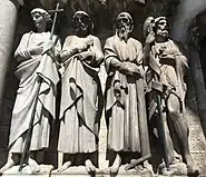 Many of the figures relate to Christian iconography, and echo those in the tympanum, including, in the ambulatory a window showing God as the King of Heaven overlooking the evangelists Matthew, Mark, Luke and John. In the panel, Matthew takes human form, Mark is depicted as a lion, Luke as an ox, while John takes the form of an eagle.[47] As elsewhere in the cathedral, the illustrations can be divided between the divine, wise and foolish.[52]