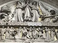 The imagery of the tympanum is taken from the Book of Revelation, with the divine on the upper register, and mortals below. It shows an angel, accompanied by John the Evangelist, measuring the temple in Jerusalem, while beneath them the dead rise from their graves.[23] Of these sculptures, the Victorian critic Charles Eastlake, writing in A History of the Gothic Revival, considered that "no finer examples of decorative sculpture have been produced during the Revival".[1]