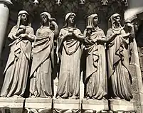 Burges' designs for the western façade were based on medieval French iconography. He considered this front to be the most important exterior feature as it would be lit by the setting sun and thus the most dramatic.[42] The theme is The Last Judgement, with representations of the twelve Apostles bearing instruments of their martyrdom, the Wise and the Foolish Virgins, the Resurrection of the Dead and the Beasts of The Evangelists.[43] The gilded copper "resurrection angel" facing eastwards on the main spire is locally the cathedral's most iconic feature, and colloquially known as the "goldie angel".[30] It was designed by Burges and erected in 1870 free of charge as his gift to the city, in recognition of Cork's willingness to fund his original design, and positioned in place of an intended wrought-iron cross.[39]