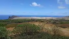 Logistics of the airport's construction were critical, because of the island's isolated location and the lack of construction equipment, which would require everything such as extremely heavy duty equipment and materials to be shipped in, thus resulting in a huge and unique logistics operation.[28] Due to the limited landing infrastructure, with no breakwater or mooring facilities at the sea front, new harbour facilities capable of handling construction equipment and fuel supplies were constructed at Rupert's Bay.[30] Fuel transfers between Rupert's Bay and the aerodrome, connected by a 14-kilometre (9 mi) haul road, were assumed to be by road tanker for 20 years, after which a capital allowance was made for enlargement of the bulk fuel storage and the installation of a fuel transfer pipeline.[31]