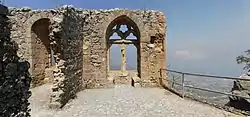 The upper ward was surrounded by a 1.4 metre-thick Byzantine wall, made of rough masonry. The entrance is through a pointed arch built by the Lusignans. This was protected by a semicircular tower to the east. Within the ward is a courtyard, with twin peaks being situated to either side of it. To the north-east is an extremely ruined kitchen. To the west are the royal apartments, dated by various sources to the 13th or 14th centuries. Although mostly ruined today, this was a structure in the northeast-southwest axis, with a length of 25 m and width of 6 m. It has a basement containing a cistern and two floors. The ground floor has a height of 7 m and a pointed barrel vault. The upper floor is known for its carved windows, one of which is dubbed the Queen's Window.[4][1] These are placed on the western wall, which has a scenic view of the northern coast of Cyprus, especially the plains of Lapithos.[5]