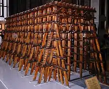 William Handyside and other engineers used a number of technological innovations in the construction of the building.[23] The portico columns were raised with the use of large wooden frameworks before the walls were erected. The building rests on 10,000 tree trunks[9] that were sunk by a large number of workers into the marshy banks upon which the cathedral is situated. The dome was gilded by a technique similar to spraypainting; the solution used included toxic mercury, the vapors of which caused the deaths of sixty workers.[24][25] The dozen gilded statues of angels, each six metres tall, facing each other across the interior of the rotunda, were constructed using galvanoplastic technology,[9] making them only millimeters thick and very lightweight. St. Isaac's Cathedral represents the first use of this technique in architecture.