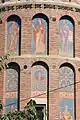 Reconstruction began in 1888, with a view toward a final form that expressed the artistic ideals of Stephen's era. From the annexes, only a nearby wall fragment surrounding the church was left standing. Lecomte du Nouÿ returned to the church's initial plan, placing the walls and the spire in one vertical sweep and eliminating the buttresses, thus giving the whole a much more sleek appearance. The exterior walls, above the stone base, were decorated with panels of visible brick and with traditional Moldavian elements such as rows of niches, discs of glazed and colored ceramic and large recesses.[1]