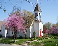 St. Paul's Episcopal Church is a historic Carpenter Gothic style Episcopal church building located on a triangular lot at 416 Southeast Grand Avenue at the corner of Fifth and Green streets in Lee's Summit, Missouri, United States. The parish was established in 1867. The original sanctuary and current building were designed by the Rev. Frederick B. Scheetz and completed in 1884. The building is a rare example of an extant wood framed Carpenter Gothic church in the state of Missouri. The interior walls and vaulted ceilings are covered with narrow strips of wood paneling set diagonally on the walls and horizontally on the ceiling. A trio of stained glass windows is set above the wooden altar in the apse at the north end of the transept. The church has received few if any alterations since it was built in 1884.[2]