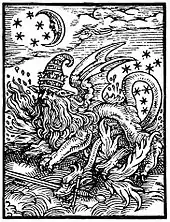 A frequently-cited[9][10][11][12] illustration of a salamander is presented in an influential[13] 20th-century occult work by Manly P. Hall, Secret Teachings of All Ages, in which it is attributed to Paracelsus.[14] This illustration appears to originate in a 1527 anti-papal tract by Andreas Osiander and Hans Sachs, where it is identified as "the Pope as a monster".[15] Its association with Paracelsus derives from his Auslegung der Magischen Figuren im Carthäuser Kloster zu Nũrnberg[16] in which the author presents explanations of some illustrations found in a Carthusian monastery in Nuremberg; the illustration in question he labels as "a salamander or desolate worm with a human head and crowned with a crown and a pope hat thereon,"[17] which is later explained to represent the Pope. Catholic Archbishop Raymund Netzhammer (1862–1945) explained that the set of woodcuts it belongs to was commissioned by Osiander based on some old "pope illustrations" found at the monastery, which Netzhammer thought may have dated back to the time of Joachim of Fiore (d. 1202) and were intended as cartoons mocking the Pope and the Church.[18]