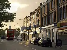 Following the completion of a tramway between Manchester and Stretford in 1901, the British Electric Traction Company applied to Parliament for an extension to Sale. The proposal was amended to continue the line further south, into Altrincham. The line through Sale was owned by Sale Urban District Council and leased to the Manchester Corporation. Services to Sale commenced in 1907. A branch along Northenden Road from the line to Sale Moor was created in 1912. Sale Moor's line had only a single track which in 1925 resulted in a head-on collision between two tramcars, injuring eight passengers.[143] Bus services were first introduced to the area in the 1920s, but became more widespread in the 1930s.[144] The buses did not suffer the drawback of being limited to tracks and were therefore more practical than the tram services, which from the 1930s went into decline. The tramlines along Northenden Road were removed between 1932 and 1934, and throughout Sale in the 1940s.[143]