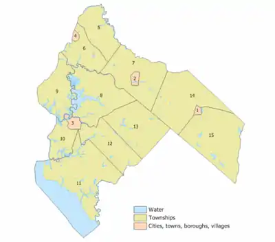 | Pittsgrove Township | 15 | township | 9,393 | 3,445 | 45.92 | 0.83 | 45.08 | 208.3 | 76.4 | Brotmanville Centerton Norma Olivet CDP (1,408) |