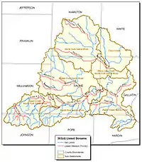 The Saline River is a tributary of the Ohio River, approximately 27 miles (43 km) long,[3] in the Southern Illinois region of the U.S. state of Illinois. The river drains a large section of southeast Illinois, with a drainage basin of 1,762 square miles (4,564 km2). The major tributaries include the South Fork, Middle Fork and North Fork, all lying within the Saline Valley. The once meandering swampy river was important among Native Americans and early settlers as a source of salt from numerous salt springs where it was commercially extracted in the early 19th century.