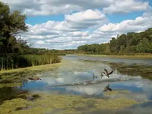 Salt Creek is a 43.4-mile-long (69.8 km)[1] stream in northeastern Illinois.[2] It is an important tributary of the Des Plaines River, part of the Illinois River and ultimately the Mississippi River watersheds. It rises in northwest Cook County at Wilke Marsh in Palatine and flows in a meandering course generally southward through DuPage County, returning to central Cook County and emptying into the Des Plaines River in Riverside, Illinois. Most of the creek's watershed is urbanized, densely populated and flood-prone.