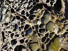 The rocks of Salt Point are sedimentary sandstone. Due to the large amounts of sandstone, small cave-like features called tafoni can be found along the shore of Salt Point.