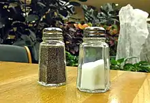 Salt and pepper are typically maintained in separate shakers on the table, but they may be mixed in the kitchen. They are typically found in a set (pair), often a matched set, of salt and pepper shakers.[1] They may be considered condiments or seasonings; salt is a mineral and black pepper is a spice.
