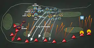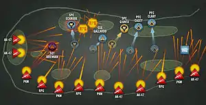 Sergeant Joshua Brennan, leader of Alpha Team and one of Giunta's best friends, was walking point.[15] He was followed by SPC Frank Eckrode, squad leader Erick Gallardo, and then Giunta, who was then a specialist. PFC Kaleb Casey and Garrett Clary followed Giunta. A 13-man Headquarters (HQ) unit led by Lt. Brad Winn, including a five-man gun team from weapons squad,[16] along with a nurse who volunteered for the mission, followed immediately behind them. When the Taliban opened fire, Brennan was struck by eight rounds and Eckrode was hit by four rounds.[15] Gallardo attempted to sprint forward, but RPGs exploding among the thin trees and 18 inches (46 cm)-high bushes around him along with machine gun and small arms fire stopped him.[17] Unable to advance, he fell back to join Giunta's Bravo Team. While backpedaling and firing at the same time, he fell and was in the same moment struck in the helmet by an AK-47 round. The round penetrated his helmet but only grazed his scalp.[11][5] An RPG round struck very near Giunta, who was returning fire and directing Bravo Team from a small defilade. Giunta was puzzled that the lip of the small depression he lay in was not protecting him from rounds cracking by his head, that they appeared to be coming from the north as well as the west.[13]