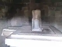The body of the main temple measures 5 by 5 metres (16 ft × 16 ft) and 2.5 metres (8 ft 2 in) high. Around the temple walls are niches containing statues of Hindu gods, topped by Kala's head. In the northern niche, there is a Durga statue, in the eastern niche, a Ganesha statue, and in the southern niche, an Agastya statue. The portal to the main room is on the western side. The entrance is flanked by niches that once contained guardian statues of Mahakala and Nandisvara. Inside the temple reside a yoni, measured 1.34 by 1.34 metres (4 ft 5 in × 4 ft 5 in) and 1.18 metres (3 ft 10 in) high. On the north side of the yoni, there is a waterspout supported by a Nāga serpent. Atop the yoni is a lingga measuring 0.29 by 0.29 metres (11 in × 11 in) at the base and 0.85 metres (2 ft 9 in) high.[2]