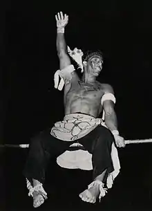 Sammy Seminole debuted at the 1958 FSU Pow Wow homecoming event.[1] For the first several years he was portrayed by white students from FSU's gymnastics program wearing faux-Native American garb. The character led the Seminoles football team onto the field at the start of the game, and then led the crowd by performing cheers and acrobatic stunts. The gymnastics program ceased sponsoring Sammy Seminole in 1968, though the character was soon re-introduced. In the late 1960s Sammy Seminole was joined by the even more stereotyped "Chief Fullabull", who served as the mascot for the basketball team.[2][3]