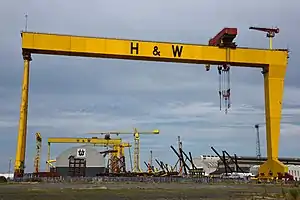 Samson and Goliath are the twin shipbuilding gantry cranes situated at Queen's Island, Belfast, Northern Ireland. The cranes, which were named after the Biblical figures Samson and Goliath, dominate the Belfast skyline and are landmark structures of the city. Comparative newcomers to the city, the cranes rapidly came to symbolise Belfast in a way that no building or monument had hitherto done.[1]