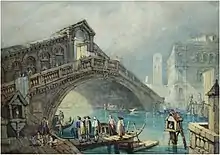 Samuel Prout was born at Plymouth, the fourth of fourteen children born to Samuel Prout Senior, a naval outfitter in the dockyard city, and Mary Cater.[1] Attending Plymouth Grammar School he came under the influence of Headmaster Dr. John Bidlake who encouraged the young Prout and Benjamin Robert Haydon in their artistic apprenticeship. They spent whole summer days drawing the quiet cottages, rustic bridges and romantic watermills of the beautiful valleys of Devon. With John Britton, he made a journey through Cornwall to try his hand in furnishing sketches for Britton's Beauties of England. In 1803 he moved to London, where he stayed until 1812. Marrying Elizabeth Gillespie in 1810, they had four children; Rebecca Elizabeth (b. 1813), Elizabeth Delsey (b. 1817), Isabella Anne (b. 1820), and Samuel Gllespie (b. 1822).[1]