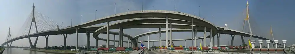 The Bhumibol Bridge (Thai: สะพานภูมิพล), also known as the Industrial Ring Road Bridge (Thai: สะพานวงแหวนอุตสาหกรรม) is part of the 13 km long Industrial Ring Road connecting southern Bangkok with Samut Prakan Province. The bridge crosses the Chao Phraya River twice, with two cable-stayed spans of lengths of 702 m and 582 m supported by two diamond-shaped pylons 173 m and 164 m high. Where the two spans meet, another road rises to join them at a free-flowing interchange suspended 50 metres above the ground.