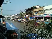 Samut Songkhram's main station, Maeklong, is on the Maeklong Railway. The railway is known for its route through the Maeklong Railway Market, nicknamed (Thai: ตลาดร่มหุบ; RTGS: talat rom hup), meaning the 'umbrella pulldown market'.[26] It is one of the largest seafood markets in Thailand, and is centred on the Maeklong Railway's track.[27] Whenever a train approaches, the awnings and shop fronts are moved back from the rails, to be replaced once the train has passed.[28]