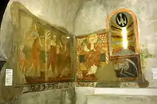The hermitage housed many fine Romanesque frescoes from about 1125; most of these have been removed, but some have remained. Two sections, transferred to canvas, are now in the Indianapolis Museum of Art, showing the Entry of Christ into Jerusalem and the Wedding at Cana.[7] Other sections, including The Healing of the Blind Man and the Raising of Lazarus and The Temptation of Christ are in the Metropolitan Museum of Art in New York,[8] and in the Prado. The paintings were done by the Catalan Master of Tahull (Taüll in Catalan), whose best known works are in Sant Climent de Taüll and the Museu Nacional d'Art de Catalunya in Barcelona,[9] with two other painters. The scenes of the Life of Christ are unusual in Spanish painting at this period; these are in American museums, while smaller elements including scenes of hunting and falconry and decorative copies of textiles are in Madrid as well as New York.[10] The frescoes include that of a camel and of a war elephant, which were inspired by Muslim motifs.[1]