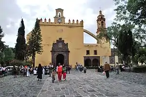The church was in charge of various communities outside of Xochimilco proper including Santiago Tepalcatlalpan, San Lucas Xochimanca, San Mateo Pochtla, San Miguel Topilejo, San Francisco Tlalnepantla, San Salvador Cuautenco, Santa Cecilia Ahuautla, San Andrés Ocoyoacac, San Lorenzo Tlatecpan, San Martín Tiatilpan, Santa Maria Nativitas Zacapan and Santa Cruz Acalpixcan, which are now in the boroughs of Xochimilco and Tlalpan.[3] As the population adopted Christianity, they were allowed to keep a number of traditional practices to mix with Catholic rites.[1] The best known of these traditions centers on the Niñopa, an image of the Child Jesus which dates to the 16th century. It and other images of its type were promoted by the evangelists to replace a cult to a child god which was prevalent in Xochimilco at the time of the Conquest. Today, this image is cared for by a family for a year, changing houses on 2 February with this most important annual event of the borough occurring at this church.[4][5][6]