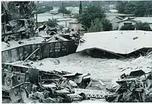 On May 12, 1989, at 7:36 a.m. a 6-locomotive/69-car Southern Pacific freight train (SP 7551 East, computer symbol 1 MJLBP-11) that was transporting trona, lost control while descending Cajon Pass, derailed on an elevated curve and plowed into a residential area on Duffy Street.[1] The location is just northeast of where the 210 Foothill Freeway crosses the Cajon Creek wash.