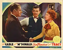 San Francisco is a 1936 musical-drama disaster film directed by Woody Van Dyke, based on the April 18, 1906 San Francisco earthquake. The film stars Clark Gable, Jeanette MacDonald and Spencer Tracy. The very popular singing of MacDonald helped make this film a major hit, coming on the heels of her other 1936 blockbuster, Rose Marie. Famous silent film directors D. W. Griffith and Erich von Stroheim worked on the film without credit. Griffith directed some of the mob scenes while von Stroheim contributed to the screenplay.[3]