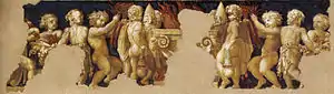Correggio executed five frescoes groups. The first includes the lunette with St. John and the Eagle (c. 1520), followed by the dome, with the Ascension of Christ and the drum and the four pendentives decoration. The third work was the decoration of the vault and the apse ceiling of the Cappella Maggiore, partially destroyed in 1586 when the choir was prolonged: today the central fragment with the Coronation of the Virgin (now at the Galleria nazionale di Parma) has survived. The fourth intervention was in the choir's walls, which were totally destroyed during its reconstruction. Finally, Correggio added a painted frieze which runs for the whole internal perimeter. Preparatory drawings show that also the parts executed by his pupils were designed by Correggio, such as the candelabra in the presbytery's vault and the puttos on the cross-vaults.