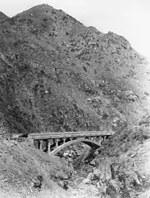 San Juan Creek begins high in the Santa Ana Mountains southwest of Lake Elsinore, at the head of the steep and narrow San Juan Canyon, at roughly 1,678 feet (511 m) in elevation where Morrell Canyon Creek, draining the western Elsinore Mountains and southernmost Santa Ana Mountains, has its confluence with Bear Canyon Creek. From there, it flows steeply down a rocky gorge over rapids and waterfalls. San Juan Canyon forms the mountain pass for California State Route 74 (the Ortega Highway), which connects San Juan Capistrano to Lake Elsinore and the Inland Empire. San Juan Falls, a 15-foot (4.6 m) cascade, and the 30-foot (9.1 m) Ortega Falls are located along the headwaters of the creek.[6] The creek then flows generally southwest through a canyon, receiving Hot Springs Creek and Cold Springs Creek from the right, and Lucas Canyon Creek from the left.[7][8][9]