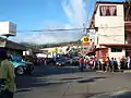 Downtown San Marcos de Tarrazu National bank branch to the left and the popular "Bar El Banco" to the right, in a busy December afternoon