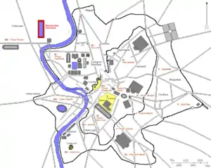 The church was originally called San Pellegrino in Naumachia.[1][2][9] A naumachia, literally "naval combat", is an artificial lake where naval battles were reenacted for an audience. The 5th century "The Passion of Peter and Paul", recounts the crucifixion of St Peter and adds: "Holy men … took down his body secretly and put it under the terebinth tree near the Naumachia, in the place which is called the Vatican".[10] The ruins of a structure were excavated in 1743, between via Alberico et via Cola di Rienzo.[11] Hülsen suggested that this structure, built close to the Circus of Nero and lying north-west of the later Mausoleum of Hadrian (today's Castel Sant'Angelo), was the naumachia the name of the church was referring to[12] and gave it the name of "Naumachia Vaticana". Subsequent excavations have helped to identify its shape, size and orientation. It was a rectangular structure with round internal and external corners, 120 metres (390 ft) wide and, estimating from the excavations, at least 300 metres (980 ft) long, oriented north–south. Esther Boise van Deman identified the style of the brickwork facing the naumachia as trajanic.[13] In 1932 Jérôme Carcopino reported the discovery among Fasti Ostienses of the dedication by Emperor Trajan on 11 November 109 of a naumachia.[14] The "Naumachia Traiani" has been identified the Naumachia Vaticana.[15][16]