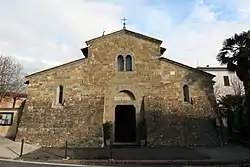 The church was built as a parish in the lower, then marshy parts of the country, putatively one of seven parishes founded by St Donatus of Arezzo in the 4th century. The Romanesque basilica structure is still evident after 19th-century restorations. The nave is separated from aisles by thick square columns. The interior has some degraded medieval frescoes by school of Guidoccio Cozzarelli, and a some later Renaissance art additions. An altarpiece dated 1634 depicts the Granting of the Keys to Peter.[1][2]