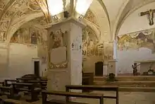 The floor of the right half of the church consisted of a schiazze paving dating back to 1528. This consisted of rectangular local stones of various sizes and colour shades. The roof was tiled on the left side and had cross vaults and ribs on the right. An immersion baptismal font, which might have been a Roman altar, was moved to the parish house in the early 1970s to protect it from theft.[7] The left aisle of the church was richly decorated with frescoes and a loggia with an iconostasis. The frescoes were the works of a number of artists, including Giovanni and Antonio Sparapane, Nicola d'Ulisse and Domenico di Jacopo. The right aisle was not richly decorated, but its floor was engraved with an unrealized project for a bell tower.[2]