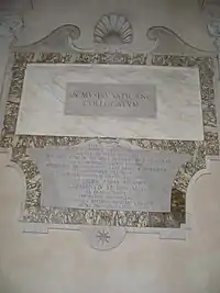 According to the founding tradition,[3] in 258, during the Valerian persecutions, the catacombs were temporarily used as place of sepulture of two other saints martyred in Rome, Peter and Paul,[4] whose remains were later transferred to the two basilicas carrying their names: whence the original dedication of the church, Basilica Apostolorum ("Basilica of the Apostles"). The dedication to Sebastian dates to the 9th century.[5]