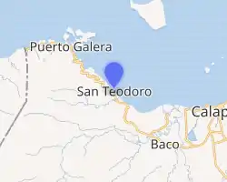 San Teodoro is 32 kilometres (20 mi) west of the province's capital, Calapan, 19 kilometres (12 mi) east from Puerto Galera, and about 140 kilometres (87 mi) south of Philippine capital Manila. It is located on the northern part of Oriental Mindoro. It is bounded to the north by the Verde Island Passage, to the east by Baco, to the west by Puerto Galera, and to the south by Santa Cruz in Occidental Mindoro province.