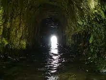 Prior to this San Vicente had been the premiere trout fishing stream in the county, so the fill caused some outrage in the local papers. An editorial in the Santa Cruz Surf at the time said: "The San Vicente Creek, beloved of the angler and the artist, has its mouth stopped by a vast dyke, and its throat choked into a tunnel, a saloon on its border, and its bed for miles denuded of the granite cobbles and sand beds. A sawmill is swiftly cutting out the timber and dirt and debris defile the pools and clog the riffles where lurked the gamey trout."[4]