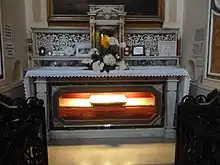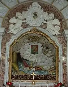 The construction of the building began in 1580 by the municipality of Mugnano del Cardinale.[2] The construction ended in 1600 and was named after Our Lady of Graces. The founder of the Sanctuary was Father Francesco De Lucia, born in Mugnano del Cardinale on September 19, 1772. Before entering the priesthood, he taught philosophy in the House of Iliceto, the novitiate of the religious of Alphonsus Liguori. After priestly ordination, on September 19, 1796, he settled in Naples, where he opened a school of philosophy and literature; in the capital of The Kingdom of the Two Sicilies, De Lucia was highly esteemed by some notable figures, including Bartolomeo De Cesare, future Bishop of Potenza, and Joseph Pignatelli, restorer of the Society of Jesus.[3] In 1805, De Lucia went to Rome to accompany the Bishop of Potenza, Bartolomeo De Cesare, on a visit to Rome on behalf of Ferdinand IV of Naples. On this occasion, thanks to De Cesare, he obtained the remains of Saint Philomena from Pope Pius VII, found in the Catacomb of Priscilla together with a small glass phial believed to contain the blood of Philomena.[4] The niche was closed by three tiles on which the following words were read: LUMENA | PAX TE | CVM FI, with the symbols of the lily, the palm and the anchor; the tiles were given on July 11, 1827 to the Shrine by Pope Leo XII. Back in Naples, with the presence of the Bishop of Nola Vincenzo Torrusio, the remains were placed in a statue of a girl covered in clothes donated by Angela Terres. They left Naples on the evening of August 9 to return to Mugnano on the morning of August 10, when the remains were placed in the Our Lady of Graces Church. In September 1805, De Lucia donated the remains to the municipality of Mugnano del Cardinale who in turn donated it to King Ferdinand II of the Two Sicilies on April 22, 1836 together with the church itself.[5]