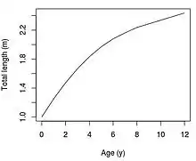 In the north Atlantic, sand tiger sharks are born about 1 m in length. During the first year, they grow about 27 cm to reach 1.3 m. After that, the growth rate decreases by about 2.5 cm each year until it stabilises at about 7 cm/y.[19] Males reach sexual maturity at an age of five to seven years and approximately 1.9 m (6.2 ft) in length. Females reach maturity when approximately 2.2 m (7.2 ft) long at about seven to ten years of age.[19] They are normally not expected to reach lengths much over 3 m. In the informal media, such as YouTube, there have been several reports of sand tigers around 5 m long, but none of these have been verified scientifically.