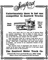 ![]() Sanford Motor Truck Company - Advertisement - Syracuse Herald - October 5, 1919 |