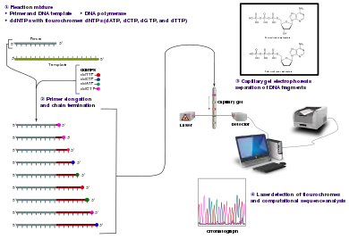 Sanger sequencing is a method of DNA sequencing based on the selective incorporation of chain-terminating dideoxynucleotides by DNA polymerase during in vitro DNA replication.[1][2] After first being developed by Frederick Sanger and colleagues in 1977, it became the most widely used sequencing method for approximately 40 years. It was first commercialized by Applied Biosystems in 1986.[3] More recently, higher volume Sanger sequencing has been replaced by "Next-Gen" sequencing methods, especially for large-scale, automated genome analyses. However, the Sanger method remains in wide use, for smaller-scale projects, and for validation of Next-Gen results. It still has the advantage over short-read sequencing technologies (like Illumina) in that it can produce DNA sequence reads of > 500 nucleotides.