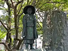 In 1932, Santōka settled down for a time at a cottage in Yamaguchi prefecture. He named it “Gochūan”[18] (其中庵) after a verse in the Lotus Sutra.[19] While there, he published his first book of poems Hachi no ko (鉢の子,“Rice Bowl Child”). He lived on the contributions of friends and admirers, whatever he could grow in his garden, and money sent from his son Ken. In 1934 he set off again on a walking trip, but soon grew seriously ill and had to return home. He attempted suicide but lived.[20] In 1936, he again began to walk, intent on following the trail of the famous haiku poet Bashō (1644–1694) as described in Oku no Hosomichi (The Narrow Road to the Interior).[21] He returned to Gōchuan after eight months.