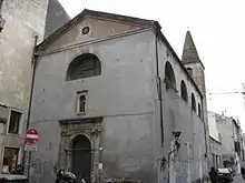 A church was present here by the 12th century, but the present structure, except for the still standing Romanesque bell-tower, with a steep conical roof, was erected starting in 1362. The facade is from the 16th century. The portico and adjacent vicariate was removed in the 20th-century. The Renaissance portal is still in place was complete by Giovanni Maria Mosca.[1]