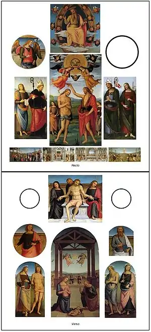 The monks caused very long delays, meaning that the predella was completed by Perugino's studio assistants using drawings by the artist himself. The drawings for the works in the first phase probably used silver-point, which can now be seen under infrared light. All the panels are painted with a single light source coming from the left.[2] Baptism re-uses a composition from the Annunziata Polyptych and the symmetrical angels from Madonna della Consolazione. The flanking panels of the saints show precise draughtsmanship as well as high detail in the flowers and small plants on the ground.[2]