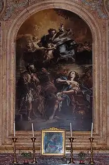 The main altar was commissioned by Cardinal Neri Corsini and designed by the architect Nicola Salvi. He made it into an elegant and refined synthesis of marble and gilded metal. The top of the altar rests on an urn in porphyry rosso antico, the costly stone of the ancients, that contains the putative relics of Saint Eustace. The altarpiece was painted in 1727 by Francesco Ferdinandi (1679–1740), also named "l'Imperiali". It represents the martyrdom of Saint Eustace and his family who were roasted to death inside a bronze statue of a bull or an ox, in the year AD 118. The gilded wooden baldachin (circa 1746) over the main altar is attributed to Ferdinando Fuga (1699–1781).