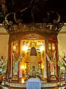 The main altarpiece or the retablo is in churrigueresque style, characterized by heavy ornamentation, which is further highlighted by gold leaf on its details. It has thirteen niches, framed with solomonic and churrigueresque columns.[2] The tabernacle or sagrario occupied the central niche at the lower level and is flanked by Franciscan Saints, namely Saint Bonaventure , Saint Peter of Alcantara, Saint Bernardino of Siena and Saint Clare. The central niche of the second or main level is occupied by Our Lady of the Abandoned at the center, which is flanked by the images of Saint Dominic and Saint Francis of Assisi, founders of Catholic religious orders, and Biblical figures Saint John the Baptist and Saint John the Evangelist. The upper level niches contained the images of Saint Anne (the titular patron of Santa Ana district) at the center with Saint Peter and Saint Paul on its sides. At the top the retablo is the image of Saint Michael the Archangel, which is flanked by medallions containing the painted images of Saint Didacus and Saint Paschal Baylon.